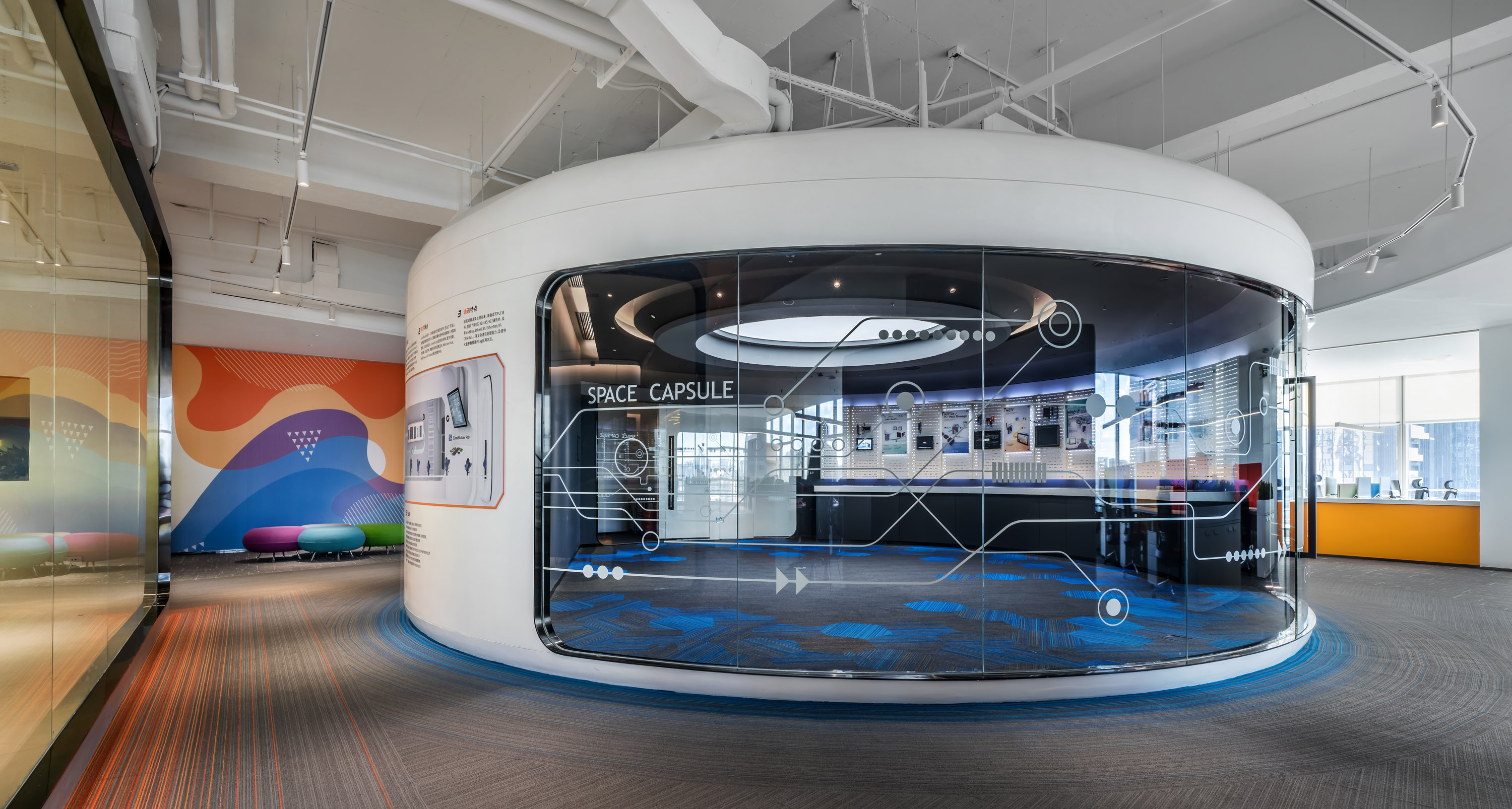 將空間仿似成飛行器,賦予他們新的意義,實驗室被稱為“太空艙”,休息區(qū)稱為“知識補給站”,電話亭稱為“通訊艙”,承載著期待與夢想,飛上穿越時光的旅程。